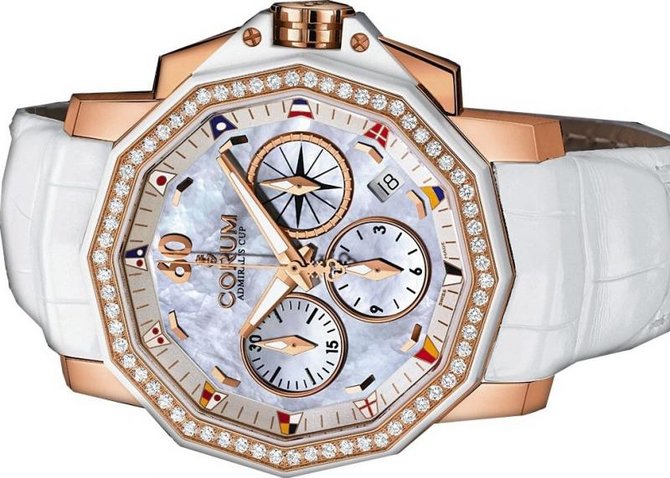 Продолжаем знакомиться с изделиями от всемирно известного швейцарского производителя часов Corum, основанного в 1955 году. Admiral`s Cup Challenger 40 Chrono Diamonds 984.970.85/0089 PN14 это женская версия часов, воплотившая в себе как спортивный дух, так и элегантность. Корпус часов изготовлен из розового золота со вставками из каучука. Безель инкрустирован белыми бриллиантами. Размеры корпуса 40 мм. Модель оснащена функциями индикации часов, минут, секунд и экраном отображения даты расположенном на позиции между 4 и 5 часами. На позиции 6 и 9 часов расположены счётчики хронографа (12- часовой и 30-минутный), отделка которых выполнена из белого перламутра. На белом жемчужном циферблате нанесены золотистые маркеры часов и минут, на фланце, легко узнаваемые бренд, изображения морских вымпелов. Прочное сапфировое стекло с антибликовым покрытием, защищает часы от повреждений и царапин.На торце заводного ключа выгравирована эмблема бренда Corum – ключ. Над заводным ключом находится кнопка запуска хронографа, ниже ключа - кнопка сброса. Механизм завода - автоматический, оснащён калибром СО 984, запас хода составляет 42 часа. Ремешок часов изготовлен из кожи аллигатора с застёжкой из розового золота. Что касается водонепроницаемости, то она составляет сто метров.