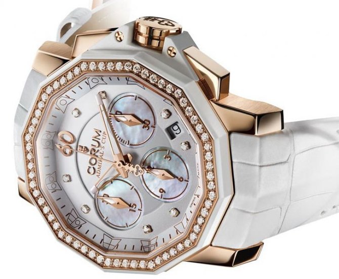 Продолжаем знакомиться с изделиями от всемирно известного швейцарского производителя часов Corum, основанного в 1955 году. Admiral`s Cup Challenger 40 Chrono Diamonds 984.970.85/0089 PN37 это женская версия часов, воплотившая в себе как спортивный дух, так и элегантность. Корпус часов изготовлен из розового золота со вставками из каучука. Безель инкрустирован белыми бриллиантами. Размеры корпуса 40 мм. Модель оснащена функциями индикации часов, минут, секунд и экраном отображения даты расположенном на позиции между 4 и 5 часами. На позиции 6 и 9 часов расположены счётчики хронографа (12- часовой и 30-минутный), отделка которых выполнена из белого перламутра. На белом жемчужном циферблате, с помощью белых бриллиантов, нанесены маркеры часов и минут, на фланце, легко узнаваемые бренд, изображения морских вымпелов. Прочное сапфировое стекло с антибликовым покрытием, защищает часы от повреждений и царапин.На торце заводного ключа выгравирована эмблема бренда Corum – ключ. Над заводным ключом находится кнопка запуска хронографа, ниже ключа - кнопка сброса. Механизм завода - автоматический, оснащён калибром СО 984, запас хода составляет 42 часа. Ремешок часов изготовлен из кожи аллигатора с застёжкой из розового золота. Что касается водонепроницаемости, то она составляет пятьдесят метров.