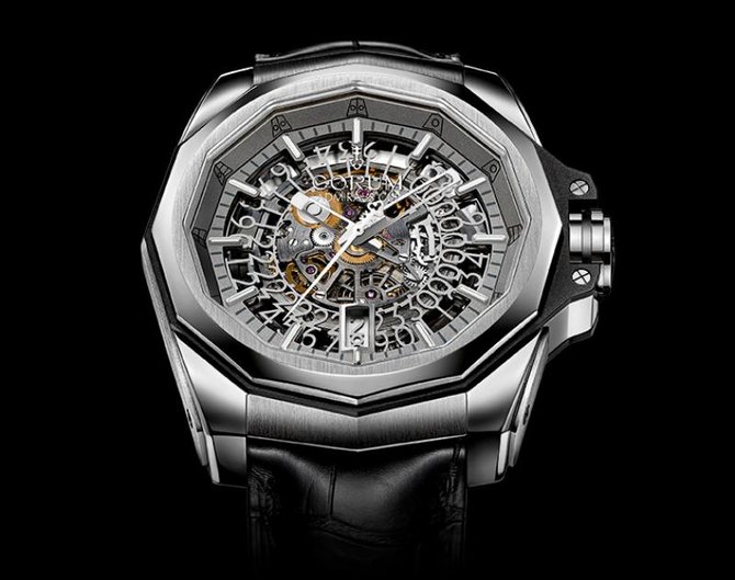 Механизм новинки от часовой фирмы Corum, часов Admiral’s Cup AC-One 45 Squelette, выходит в абсолютно раскрытой архитектуре впервые, таким образом показывая работу швейцарского Калибра CO 9000. Часы имеют просвечивающийся диск индикации даты с легко читаемыми часовыми метками. Часовые маркеры покрыты составом Superluminova. Циферблат украшен с помощью вымпелов Admiral’s Cup. Часы обладают своим популярным двенадцатисторонним безелем, установленным сверху титанового многослойного корпуса, диаметром 45 мм. Корпус частично отполирован с сатинорованными боковыми верхушками. На защитном стекле из сапфира находится логотип Corum, выполненный из металла. Задняя крышка часов прозрачная. Уникально тонко обработанный ротор часов является особенностью компании Corum. Корпус водонепроницаем до 300-от метровой глубины. Комплектуется модель ремешком из кожи крокодила с классической титановой пряжкой, выполненной из титана.