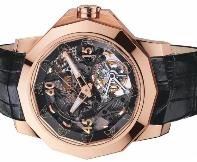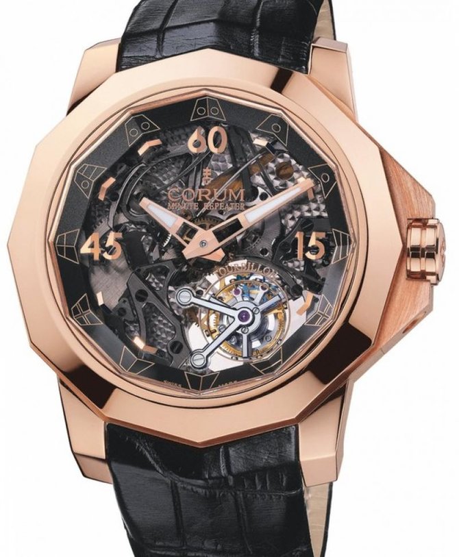 Продолжаем знакомиться с изделиями от всемирно известного швейцарского производителя часов Corum, основанного в 1955 году. Рассмотрим коллекцию, которая называется Admiral`s Cup . 010.101.55/0001 AO12 это модель, которая была приурочена к 50-летию компании. Корпус часов изготовлен из 18-каратного розового золота. Размеры корпуса составляют 45 мм. Функции часов - отображение часов и минут. У данной модели на прозрачный циферблат нанесены золотистые маркеры минут, маркеры часов отображены с помощью морских вымпелов. На позиции пяти часов расположен турбийон. Репетир запускается с помощью поворота безеля. Прочное сапфировое стеклом с антибликовым покрытием, защищает циферблат от повреждений. На торце заводного ключа выгравирована эмблема бренда Corum – ключ. Ремешок часов изготовлен из кожи аллигатора со вставкой из розового золота. Механизм завода - ручной, оснащён калибром СО 010, запас хода составляет 72 часа. Что касается водонепроницаемости, то она стандартна и составляет тридцать метров
