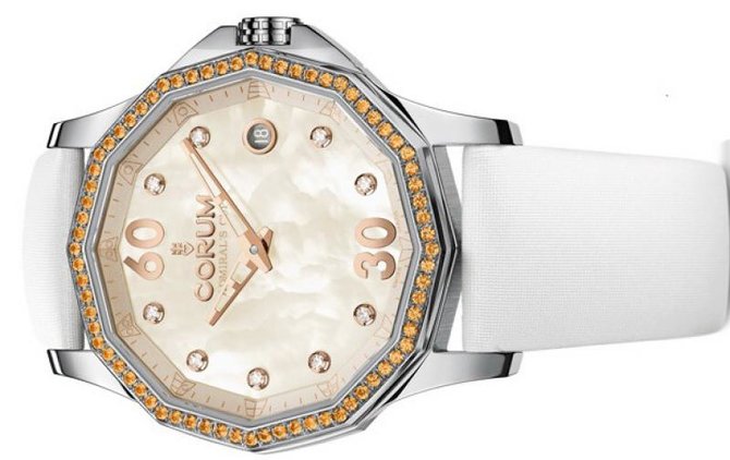 Продолжаем знакомиться с изделиями от всемирно известного швейцарского производителя часов Corum, основанного в 1955 году. Admiral's Cup Legend 38 Fiancee 082.102.47/0F49 PN09 это лимитированная женская серия часов, воплотившая в себе как спортивный дух, так и элегантность. Всего их было выпущено 50 штук. Корпус часов изготовлен из нержавеющей стали. Безель инкрустирован желтыми цитринами. Размеры корпуса 38 мм. Модель оснащена функциями индикации часов, минут и экраном отображения даты, расположенном на позиции 3 часов. На кремовом жемчужном циферблате, с помощью девяти белых бриллиантов, нанесены маркеры минут, на фланце, с помощью морских вымпелов, нанесены маркеры часов. Прочное сапфировое стекло с антибликовым покрытием, защищает часы от повреждений и царапин.На торце заводного ключа выгравирована эмблема бренда Corum – ключ. Механизм завода - автоматический, оснащён калибром СО 082, запас хода составляет 42 часа. Ремешок часов изготовлен из атласа с застежкой из нержавеющей стали. Что касается водонепроницаемости, то она составляет пятьдесят метров.