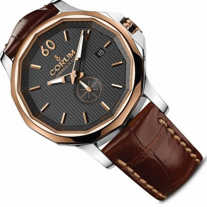 Продолжаем знакомиться с изделиями от всемирно известного швейцарского производителя часов Corum, основанного в 1955 году. Рассмотрим коллекцию, которая называется Admiral`s Cup Legend. 395.101.24/0F62 AK11 это часы, которые подтверждают статус производителя. Двенадцатигранный корпус часов изготовлен из нержавеющей стали. Фиксированный безель - розовое золото. Размеры корпуса составляют 42 мм. Модель оснащена функциями индикации часов, минут, секунд и отображения даты. На сером гильошированном циферблате нанесены золотистые маркеры часов, также имеется дополнительный секундный циферблат, расположенный на позиции 6 часов. Прочное сапфировое стеклом с антибликовым покрытием, защищает часы от повреждений и царапин. Задняя крышка прозрачна и можно рассмотреть часовой механизм. На торце заводного ключа, который изготовлен из розового золота, выгравирована эмблема бренда Corum – ключ. Ремешок часов кожаный, со вставкой из нержавеющей стали. Механизм завода - автоматический, оснащён калибром СО 395, запас хода составляет 42 часа. Что касается водонепроницаемости, то она увеличена по сравнению со стандартами, и составляет пятьдесят метров