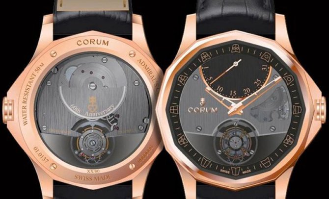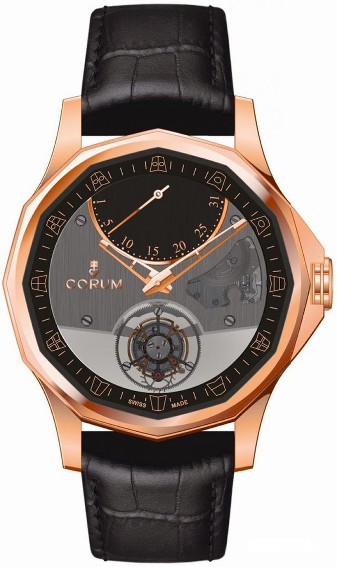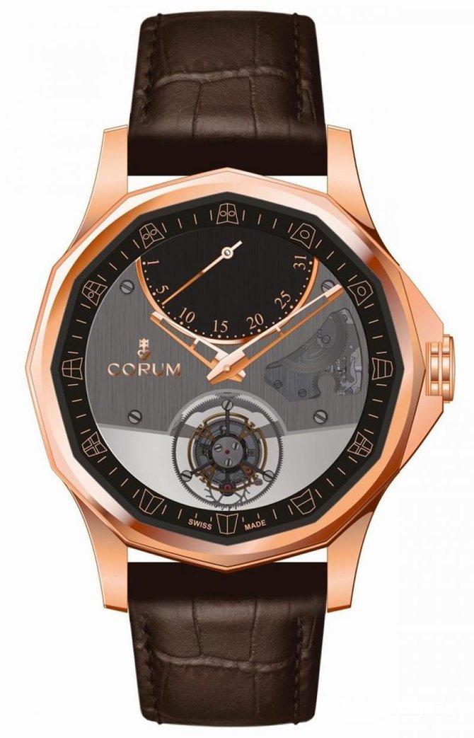Бренд-производитель швейцарских часов класса "люкс" Corum презентовал новую модель - часы с турбийоном и диаметром корпуса 42 мм, о чем можно догадаться и из самого названия модели, - Admiral’s Cup Legend 42 Flying Tourbillon. Новинка вышла в честь юбилея компании - собственного 60-ти летия. Корпус выполнен из красного золота, обладающий двенадцатигранной формой, водонепроницаемостью - 50 метров, диаметром 42 мм и толщиной 13 мм. На золотой заводной головке размещена гравировка в виде логотипа фирмы Corum. Механизм полностью защищен сапфировым стеклом, и лицевая сторона корпуса, и задняя, сквозь которую можно следить за работой механизма с автоподзаводом Corum CO 016, на 29 камнях, с балансовой частотой 21600 полуколебаний в час (3 гц), 72-часовым запасом хода, функциями индикации часов, минут и даты, а также с парящим турбийоном. На циферблате расположились морские сигнальные флажки. Лицевое сапфировое стекло с антибликовым, тонированным покрытием. Стрелки золотые, скелетонизированные. Комплектуется ремешком из кожи крокодила коричневого либо черного цвета с классической пряжкой из розового золота.