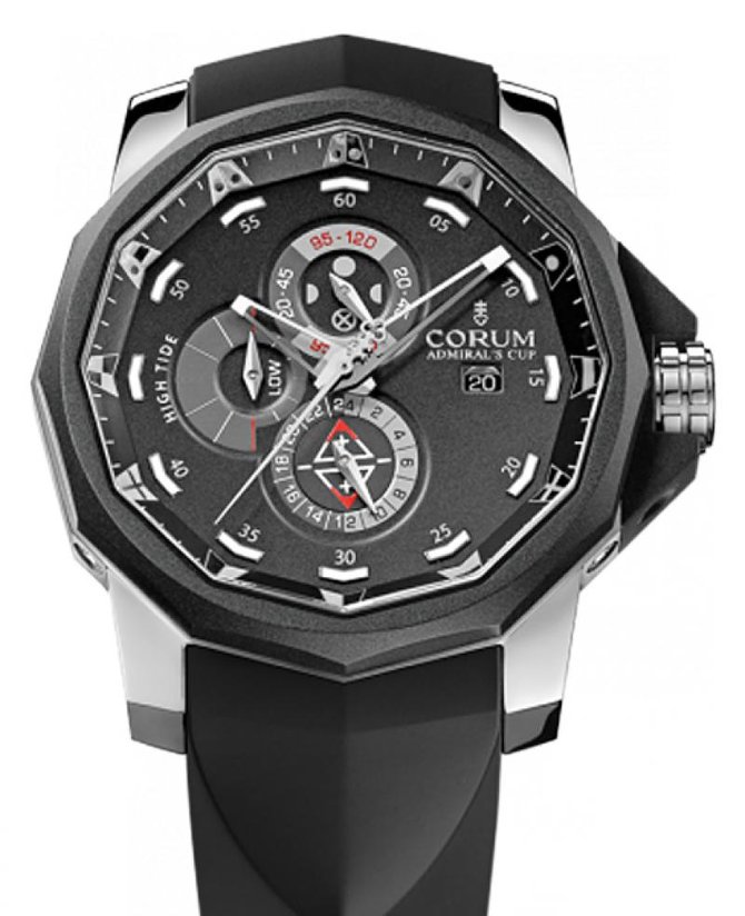 Продолжаем знакомиться с изделиями от всемирно известного швейцарского производителя часов Corum, основанного в 1955 году. Рассмотрим коллекцию, которая называется Admiral`s Cup Seafender. 277.931.06/0371 AN52 эта серия часов была разработана совместно с Женевской астрономической обсерваторией и службой гидрографии и океанографии военно-морского флота Франции. Модель отображает лунные циклы, указывая, таким образом, силу приливов и отливов, приблизительный уровень воды, силу течения и время прилива. Узнаваемый производителя двенадцатигранный корпус часов с вращающимся безелем, покрытым каучуком, изготовлен из титана. Размеры корпуса составляют 48 мм. Модель оснащена функциями индикации часов, минут, секунд и экраном отображения даты расположенном на позиции трех часов. На черном циферблате нанесены серебристые маркеры минут, маркеры часов изображены с помощью морских вымпелов. Прочное сапфировое стекло с антибликовым покрытием, защищает часы от повреждений и царапин. На торце заводного ключа выгравирована эмблема бренда Corum – ключ. Возможность спуска под воду до 300 метров. Ремешок часов изготовлен из каучука с прочной титановой застёжкой. Механизм завода - автоматический, оснащён калибром СО 277, запас хода, составляет 42 часа.