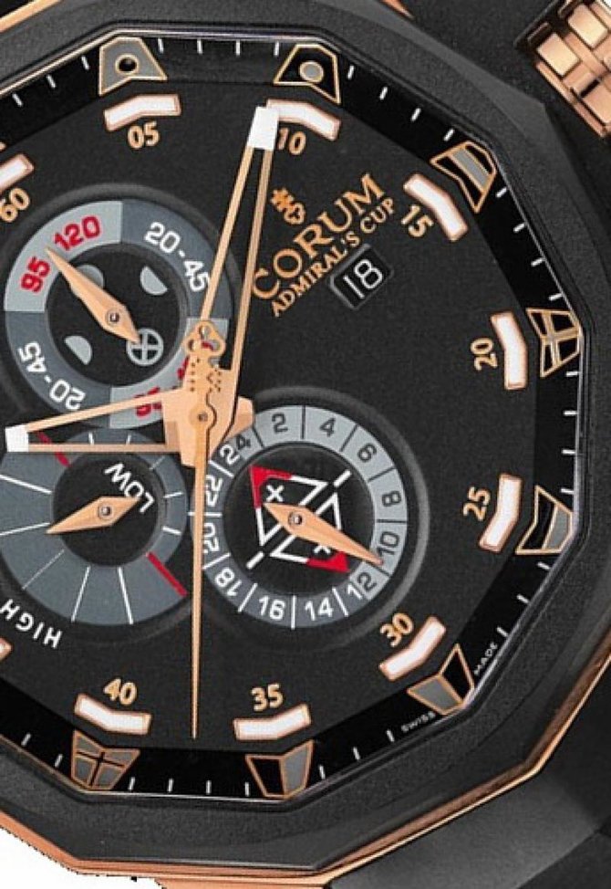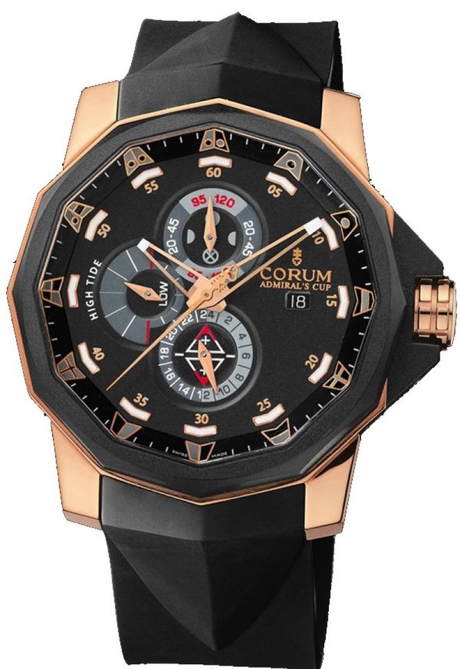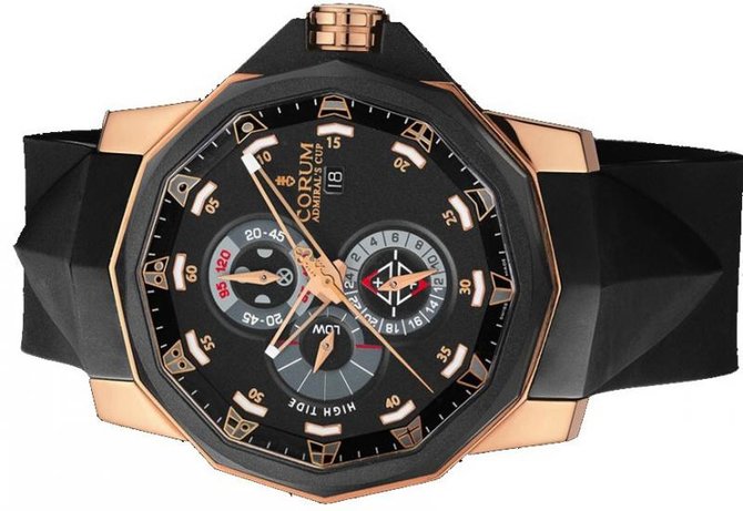 Продолжаем знакомиться с изделиями от всемирно известного швейцарского производителя часов Corum, основанного в 1955 году. Рассмотрим коллекцию, которая называется Admiral`s Cup Seafender. 277.931.91/0371 AN62 эта серия часов была разработана совместно с Женевской астрономической обсерваторией и службой гидрографии и океанографии военно-морского флота Франции. Модель отображает лунные циклы, указывая, таким образом, силу приливов и отливов, приблизительный уровень воды, силу течения и время прилива. Узнаваемый производителя двенадцатигранный корпус часов с вращающимся безелем, покрытым каучуком, изготовлен из розового золота. Размеры корпуса составляют 48 мм. Модель оснащена функциями индикации часов, минут, секунд и экраном отображения даты расположенном на позиции трех часов. На черном циферблате нанесены золотистые маркеры минут, маркеры часов изображены с помощью морских вымпелов. Прочное сапфировое стекло с антибликовым покрытием, защищает часы от повреждений и царапин. На торце заводного ключа выгравирована эмблема бренда Corum – ключ. Возможность спуска под воду до 300 метров. Ремешок часов изготовлен из каучука с застёжкой из розового золота. Механизм завода - автоматический, оснащён калибром СО 277, запас хода составляет 42 часа.