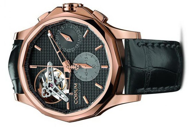 Продолжаем знакомиться с изделиями от всемирно известного швейцарского производителя часов Corum, основанного в 1955 году. Модель Admiral’s Cup Seafender Tourbillon Chronograph 47 398.550.55/0001 AN10 это серия часов, которая будет уместна как на деловой встрече, так и во время занятий спортом. Корпус часов изготовлен из розового 18-каратного золота. Размеры корпуса 47 мм. Модель оснащена функциями индикации часов, минут, секунд и экраном отображения даты, расположенном на позиции 3 часов. Основной особенностью модели является наличие турбийона (механизма, компенсирующего влияние гравитации земли на точность хода часов). На черном гильошированном циферблате нанесены золотистые маркеры часов и минут, на фланце, легко узнаваемые бренд, изображения морских вымпелов. Прочное сапфировое стекло с антибликовым покрытием, защищает часы от повреждений и царапин.На торце заводного ключа выгравирована эмблема бренда Corum – ключ. Над заводным ключом находится кнопка запуска хронографа, ниже ключа - кнопка сброса. Механизм завода - автоматический, оснащён калибром СО 398, запас хода составляет 45 часов. Ремешок часов изготовлен из кожи аллигатора с застёжкой из розового золота. Что касается водонепроницаемости, то она составляет пятьдесят метров.