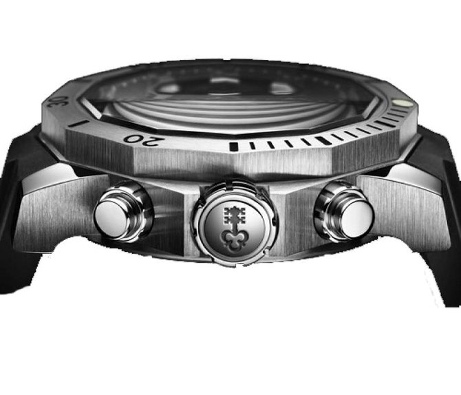 Продолжаем знакомиться с изделиями от всемирно известного швейцарского производителя часов Corum, основанного в 1955 году. Рассмотрим коллекцию, которая называется Admiral`s Cup Seafender. 753.451.04/0371 AN22 это серия часов выпущенная для дайверов. Узнаваемый производителя двенадцатигранный корпус часов с вращающимся безелем изготовлен из титана. Размеры корпуса составляют 46 мм и толщина 16 мм. Модель оснащена функциями индикации часов, минут, секунд и экраном отображения даты расположенном на позиции шести часов, также имеется хронограф. На черном циферблате нанесены серебристые маркеры минут, маркеры часов изображены с помощью морских вымпелов. Прочное сапфировое стекло с антибликовым покрытием, защищает часы от повреждений и царапин. На торце заводного ключа выгравирована эмблема бренда Corum – ключ. Возможность спуска под воду до 300 метров. Ремешок часов изготовлен из каучука с прочной титановой застёжкой. Механизм завода - автоматический, оснащён калибром СО 753, запас хода составляет 42 часа.