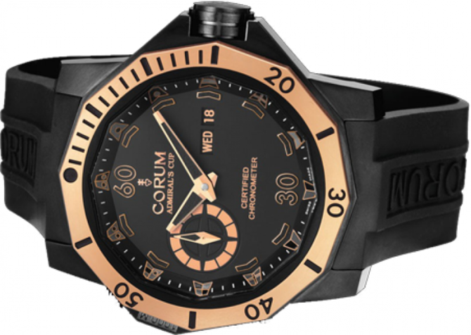 Продолжаем знакомиться с изделиями от всемирно известного швейцарского производителя часов Corum, основанного в 1955 году. Рассмотрим коллекцию, которая называется Admiral`s Cup Seafender. 947.950.86/0371 AN16 это лимитированная серия часов выпущенная для подводников и дайверов. Узнаваемый производителя двенадцатигранный корпус часов изготовлен из титана. Вращающийся безель изготовлен из розового золота. Размеры корпуса составляют 48 мм. Модель оснащена функциями индикации часов, минут, секунд и экраном отображения даты и дня недели, расположенном на позиции трех часов. Данная модель имеет сертификат швейцарской службы официального контроля за хронометрами (COSC). На черном циферблате нанесены золотисто-черные маркеры минут, маркеры часов изображены с помощью морских вымпелов. Прочное сапфировое стекло с антибликовым покрытием, защищает часы от повреждений и царапин. На торце заводного ключа выгравирована эмблема бренда Corum – ключ. Особенностью данной модели является гелиевый декомпрессионный клапан, который разработан специально для часов, которые используются профессиональными подводниками. Возможность спуска под воду до 1000 метров. Ремешок часов изготовлен из каучука с прочной титановой застёжкой. Механизм завода - автоматический, оснащён калибром СО 947, запас хода составляет 42 часа. Серия была выпущена в количестве 100 штук.