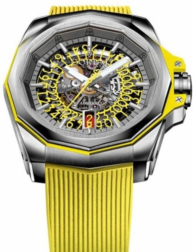 Швейцарские наручные мужские часы, модель Admiral’s Cup AC-One 45 Squelette A082/03704 - 082.401.04/F375 FH54 от мануфактуры Corum, были изготовлены в корпусе из титана с такими габаритами: 45 х 13.3 мм. Водонепроницаемость корпуса соответствует требованиям к дайверским моделям - 300 метров (30 бар, атм). На скелетонизированном циферблате желтого цвета показываются данные часов, минут, секунд и даты. Индикатор даты разместился на уровне отметки "6 часов". В часах инженеры Corum разместили автоматический мануфактурный механизм CO 082 с запасом хода на 42 часа. Ограниченный тираж - 228 экземпляров.