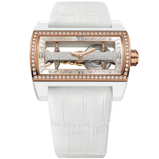 Известная на весь мир швейцарская компания Corum, которая специализируется на изготовлении великолепных часов, представляет Вашему вниманию очередную модель Corum Golden Bridge Ti-Bridge Lady 007.129.51/0009 0000. Данная модель будет интересна любительницам необычных женских дизайнов, подчеркивающие классический стиль. Корпус сложной формы отполирован до блеска, выполнен из керамики а также розового восемнадцати каратного золота, и имеет такие размеры: 40.9 х 35.2 мм. Основные функции часов это отображение часов и минут. Механизм с ручным заводом оснащен калибром CO 007, и имеет запас хода на 72 часа. Необычный циферблат скелетон - белого цвета. Ремешок часов выполнен из кожи аллигатора, оснащен золотой вставкой, а также раскладывающейся застежкой. Стрелки которые находятся на циферблате, отлиты вручную из вороненной стали. Прочное сапфировое стекло закрывает корпус, а задняя крышка находится под давлением. Водонепроницаемость модели немного увеличена и составляет пятьдесят метров. Corum Golden Bridge Ti-Bridge Lady 007.129.51/0009 0000 будет отличным дополнением к Вашему стилю. Безель модели украшен белыми бриллиантами.