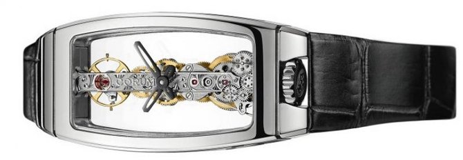 Продолжаем знакомиться с изделиями от всемирно известного швейцарского производителя часов Corum, основанного в 1955 году. Серия Golden Bridge (Золотой мост), впервые была представлена в 1980 году и сразу же произвела фурор в часовой индустрии. Miss Golden Bridge это женская коллекция часов. Серия позиционируется не только как часовой механизм, но и как дизайнерский объект. Это были первые модели часов с вертикальным механизмом в форме моста. Корпус часов, размером 43х21 мм, изготовлен из белого золота 18-к. Благодаря тому что сапфировое стекло закрывает помимо передней и задней поверхности также и боковые стороны корпуса, можно рассмотреть все нюансы работы механизма. Циферблата, как такового, в данной модели нету. Калибр часов СО 113, механический, с ручным заводом, запас хода составляет 40 часов. Заводной ключ, на торце которого выгравирована эмблема бренда Corum, находится на позиции 6 часов. Ремешок часов изготовлен из кожи аллигатора с застёжкой из 18-каратного белого золота. Что касается водонепроницаемости, то она составляет тридцать метров.