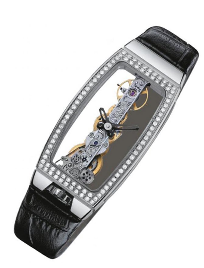 Известная на весь мир швейцарская компания Corum, которая специализируется на изготовлении великолепных часов, представляет Вашему вниманию очередную модель Corum Golden Bridge Miss Golden Bridge 113.102.69/0001 0000. Данная модель будет интересна любительницам строгих женских дизайнов, подчеркивающие бизнес стиль. Корпус прямоугольной формы отполирован до блеска, выполнен из восемнадцати каратного белого золота, и имеет такие размеры: 43 х 21 мм. Основные функции часов это отображение часов и минут. Механизм с ручным заводом оснащен калибром СО 113, и имеет запас хода на 40 часов. Необычный циферблат скелетон - золотистого цвета. Ремешок часов черного цвета, выполнен из кожи аллигатора. Стрелки которые находятся на циферблате, отлиты вручную из вороненной стали. Прочное сапфировое стекло закрывает корпус, а задняя крышка находится под давлением. Водонепроницаемость модели стандартна, и равняется тридцати метрам. Безель модели украшен белыми бриллиантами, что по достоинству оценят любительницы драгоценностей. Corum Golden Bridge Miss Golden Bridge 113.102.69/0001 0000 будет отличным дополнением к Вашему стилю.