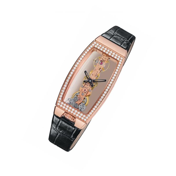 Известная на весь мир швейцарская компания Corum, которая специализируется на изготовлении великолепных часов, представляет Вашему вниманию очередную модель Corum Golden Bridge Miss Golden Bridge 113.102.85/0001 0000. Данная модель будет интересна любительницам строгих женских дизайнов, подчеркивающие бизнес стиль. Корпус прямоугольной формы отполирован до блеска, выполнен из восемнадцати каратного розового золота, и имеет такие размеры: 43 х 21 мм. Основные функции часов это отображение часов и минут. Механизм с ручным заводом оснащен калибром СО 113, и имеет запас хода на 40 часов. Необычный циферблат скелетон - золотистого цвета. Ремешок часов черного цвета, сделан из кожи аллигатора. Стрелки которые находятся на циферблате, отлиты вручную из вороненной стали. Прочное сапфировое стекло закрывает корпус, а задняя крышка находится под давлением. Водонепроницаемость модели стандартна, и равняется тридцати метрам. Corum Golden Bridge Miss Golden Bridge 113.102.85/0001 0000 будет отличным дополнением к Вашему стилю. Безель модели покрыт белыми бриллиантами, что по достоинству оценят любительницы драгоценностей.