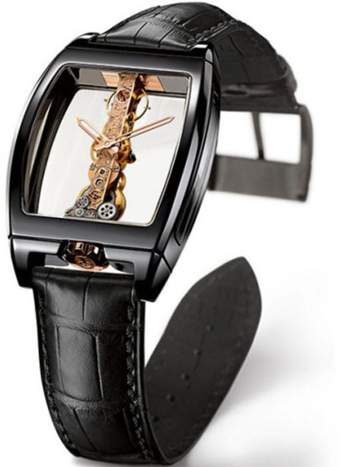 Продолжаем знакомиться с изделиями от всемирно известного швейцарского производителя часов Corum, основанного в 1955 году. Серия Golden Bridge (Золотой мост), впервые была представлена в 1980 году и сразу же произвела фурор в часовой индустрии. Это были первые модели часов с вертикальным механизмом в форме моста. Серия позиционируется не только как часовой механизм, но и как дизайнерский обьект. Корпус часов, размером 34х51 мм, изготовлен из керамики. Благодаря тому что сапфировое стекло закрывает помимо передней и задней поверхности также и боковые стороны корпуса, можно рассмотреть все нюансы работы механизма. Циферблата, как такового, в данной модели нету. Часовая и минутная скелетонизированные стрелки изготовлены из розового золота. Калибр часов СО 113, механический, с ручным заводом, запас хода составляет 40 часов. Заводной ключ, на торце которого выгравирована эмблема бренда Corum, находится на позиции 6 часов. Ремешок изготовлен из кожи аллигатора с прочной застёжкой из титана. Что касается водонепроницаемости, то она составляет тридцать метров.