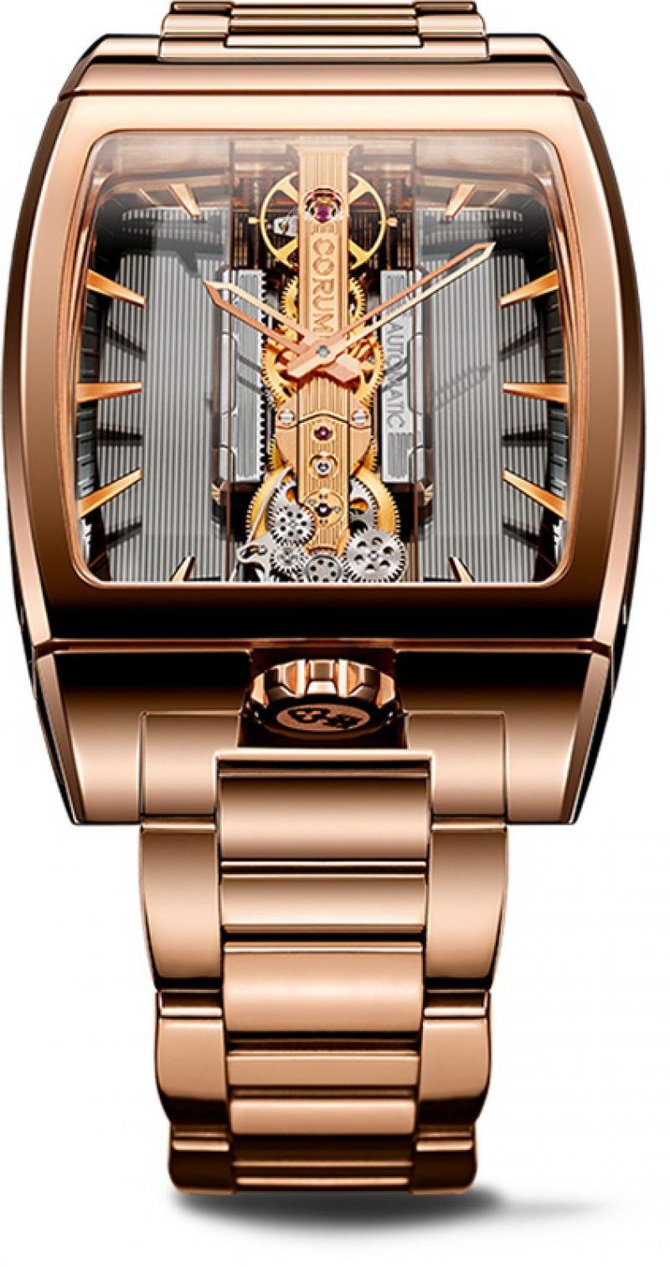 Продолжаем знакомиться с изделиями от всемирно известного швейцарского производителя часов Corum, основанного в 1955 году. Серия Golden Bridge (Золотой мост), впервые была представлена в 1980 году и сразу же произвела фурор в часовой индустрии. Серия позиционируется не только как часовой механизм, но и как дизайнерский объект. Это были первые модели часов с вертикальным механизмом в форме моста. Часы с автоматическим механизмом впервые были представлены в 2011 году. Корпус часов, размером 37.2х51.8 мм, изготовлен из розового золота. Благодаря тому что сапфировое стекло закрывает помимо передней и задней поверхности также и боковые стороны корпуса, можно рассмотреть все нюансы работы механизма. Циферблат серого цвета, гильошированый. Накладные золотистые маркеры часов и минут. Механизм завода - автоматический, оснащён калибром СО 313, запас хода составляет 40 часа. Заводной ключ, на торце которого выгравирована эмблема бренда Corum, находится на позиции 6 часов. Браслет часов изготовлен из розового золота. Что касается водонепроницаемости, то она составляет тридцать метров.