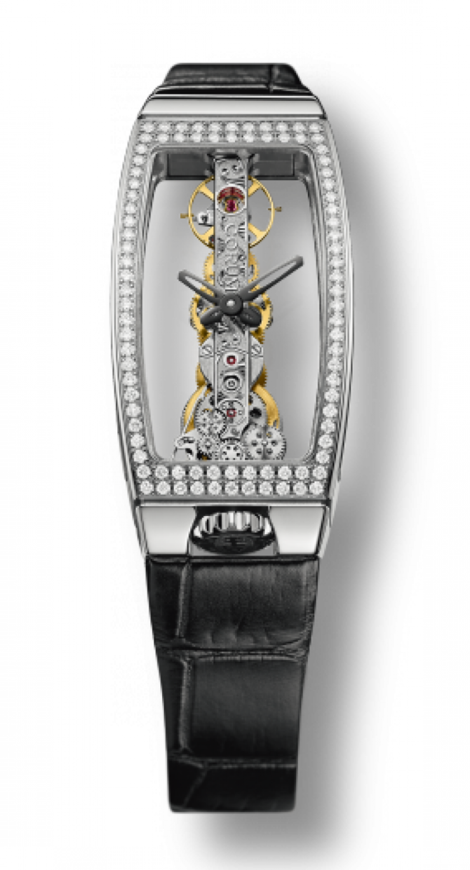 Известная и авторитетная швейцарская мануфактура Corum, которая производит разнообразные великолепные модели наручных часов, на этот раз представила очередные механические швейцарские часы - Miss Golden Bridge. Из названия не сложно догадаться, что шедевр часового искусства предназначен исключительно для дам. Часовой экземпляр будет интересен любительницам строгих женских дизайнов и несомненно подчеркнет бизнес-стиль своей владелицы. Корпус прямоугольной формы с такими габаритами: 43 х 21 мм. Основные функции часов - это отображение текущего времени с помощью часовой и минутной стрелок. Механизм функционирует от ручного подзавода, калибр СО 113. Уровень запаса хода - 40 часов. Циферблат модели - это открытый механизм со стрелками, отлитыми вручную. Прочное сапфировое стекло защищает корпус с обеих сторон. Задняя крышка находится под давлением. Водонепроницаемость корпуса - 30 метров. Корпус инкрустирован белыми бриллиантами, весом до одного карата.