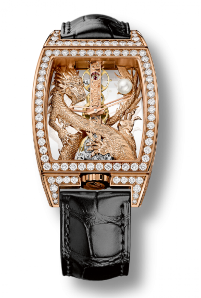 Шикарные швейцарские механические наручные часы GOLDEN BRIDGE Dragon, представленные популярной часовой мануфактурой Corum. Механизм: калибр CO 113 с ручным подзаводом, запасом хода - 40 часов; индикация - часы и минуты; частота - 4 Hz, 28 800 полуколебаний в час; размер - 14 ¾’’’ X 5’’’. Мосты и платина из золота 750-ой пробы. КОРПУС: форма - «бочонок»; размер - 34.00 X 51.00 мм; материал: титан марки 5 с черным DLC-покрытием, красное золото 5N 750 пробы (18 карат) или белое золото 750 пробы (18 карат). Ювелирные модели инкрустированы 396 круглыми бриллиантами, ~ 4.15 карат (красное золото 5N 750 пробы) или 80 багетными бриллиантами, ~ 3.90 карат и 312 круглыми бриллиантами, ~ 1.52 карат (белое золото 750 пробы). Прозрачная задняя крышка. Водонепроницаемость: 30 метров. Циферблат: скульптура дракона с гравировкой, выполненная вручную. Хвост дракона украшен жемчужинами. Ремешок из кожи аллигатора. Раскладная трехстворчатая пряжка; в ювелирных моделях застежки инкрустированы 26 круглыми бриллиантами (~ 0.31 карат).