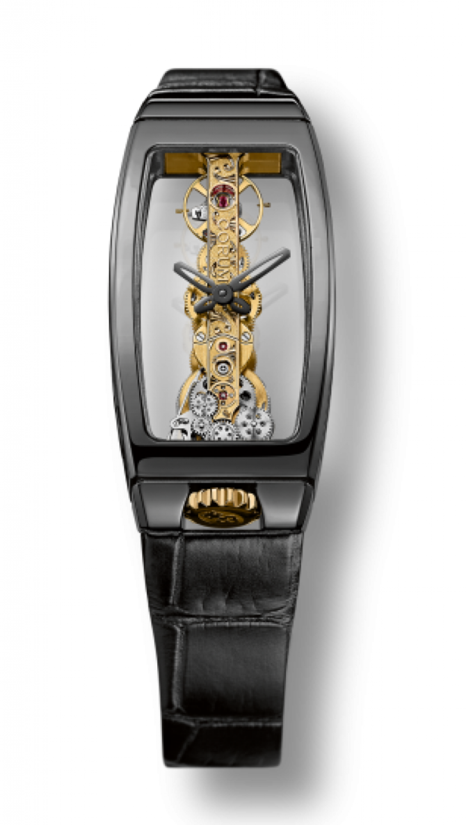 Данные дамские механические швейцарские часы пополнили коллекцию GOLDEN BRIDGE, которой в 2015 году исполняется 35 лет. Корпус изготовлен из керамики; имеет форму бочки и такие габариты: 21.00 x 43.00 мм. Лицевая и задняя часть корпуса изготовлены из сапфирового стекла. Толщина корпуса - 11.19 миллиметров, а водостойкость - 30 метров. На циферблате, представляющем из себя открытый механизм с керамическими стрелками, указываются часы и минуты. Заводная головка расположена в непривычном месте - внизу корпуса, около креплений ремешка из кожи аллигатора с золотой классической пряжкой. Механизм с ручным подзаводом, калибр CO 113, с 40-часовым запасом хода, балансовой частотой - 28 800 полуколебаний в час (4 Hz), на 19 драгоценных камнях. Модель пропитана особым новаторским духом.