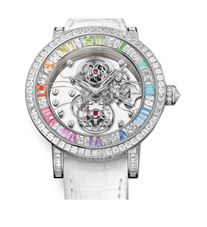 Ювелирные эксклюзивные женские механические наручные часы с турбийоном от швейцарской часовой мануфактуры Corum выпущены в круглом корпусе из белого золота, инкрустированном огромным количеством драгоценных камней. Диаметр корпуса - 46.5 миллиметров. Циферблат, задняя крышка, а также множество элементов механизма произведены из сапфирового стекла, чтобы максимально увеличить видимость драгоценностей. Скелетонизированный часовой циферблат модели указывает текущее время в часах и минутах. За индикацию отвечает мануфактурный механизм с ручным подзаводом и главным усложнением - турбийоном, калибр CO372. Запас хода механизма - 90 часов. Герметичность корпуса - 30 метров. К запястью часы крепятся с помощью ремешка из крокодильей кожи с классической золотой пряжкой.
