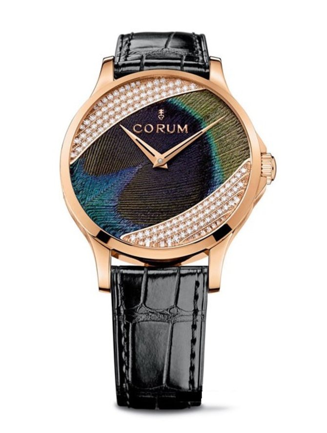 Известная часовая компания Corum представляет элегантные женские механические наручные часы в золотом корпусе. Основная функция данной модели, индикация текущего времени в часах и минутах, осуществляется на художественном циферблате благодаря мануфактурному механизму с автоматическим подзаводом, калибр CO 110, с запасом хода - 42 часа и балансовой частотой - 28 800 полуколебаний в час (4 Hz). Калибр стоит на 25 драгоценных камнях. Круглый часовой корпус изготовлен из розового золота высокого качества. Его диаметр - 39 миллиметров. Лицевое защитное стекло - сапфировое. Задняя крышка из розового золота. Толщина корпуса - 11.1 миллиметров. Герметичность - 50 метров. Ремешок, которым укомплектована данная часовая модель, из кожи аллигатора, черного цвета, оснащен классической золотой пряжкой. Эту часовую модель представители компании Corum посвятили наручным часам, выпущенным брендом еще в 1970 году.