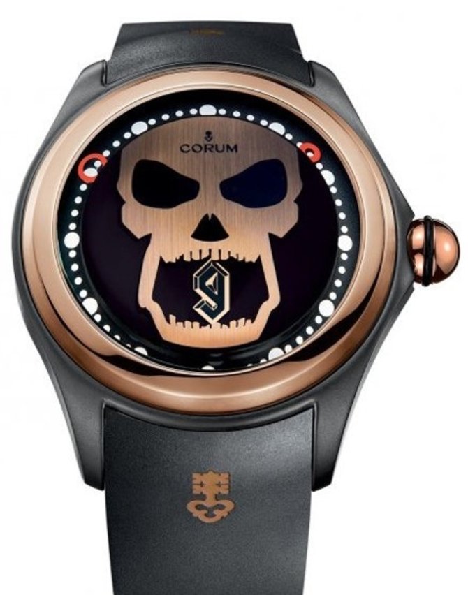 Лимитированным тиражом в 1 экземпляр представлены наручные часы Corum Bubble Big Magical Djibril Cisse в корпусе из титана с покрытием PVD черного цвета в комбинации с розовым золотом. Размер корпуса: 52 х 20.2 мм. Водонепроницаемость: 100 метров. Часы оснащены автоматическим механизмом, калибр CO 390. Циферблат черного цвета украшен мотивом 'череп'. На нем отображаются данные часов и минут. Запас хода механизма рассчитан на 65 часов. Модель комплектуется каучуковым ремешком с застежкой из чистого титана. Сапфировый кристалл с антибликовым составом защищает циферблат от повреждений.