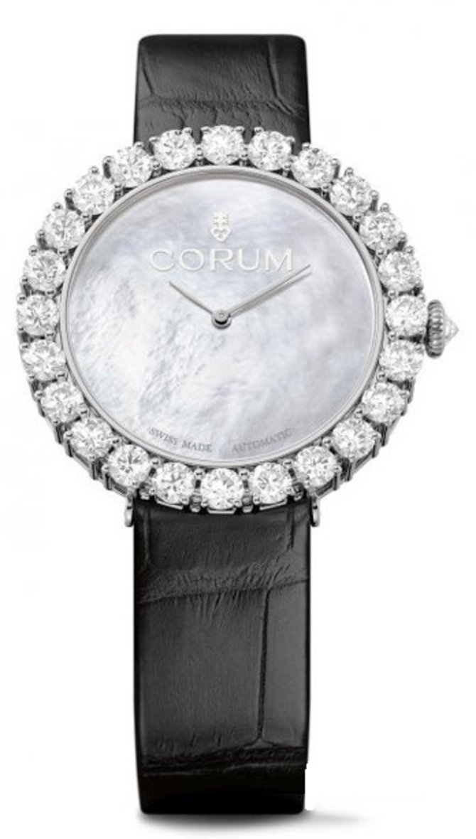 Corum Heritage Sublissima - это женские швейцарские наручные часы от легендарного бренда Corum. Круглый часовой корпус новинки украшен крупными драгоценными камнями - бриллиантами с классической огранкой. Циферблат из натурального морского перламутра изготовлен в минималистическом стиле - кроме стрелок для индикации времени и названия бренда-производителя, на нем ничего нет. Перламутровый циферблат находится под надежной защитой сапфирового кристалла. Ремень пошит из кожи аллигатора черного цвета и дополнен классической застежкой из белого золота. Корпус с герметичностью до 30 метров. Часы производятся лимитированной серией - всего 18 экземпляров на весь мир.