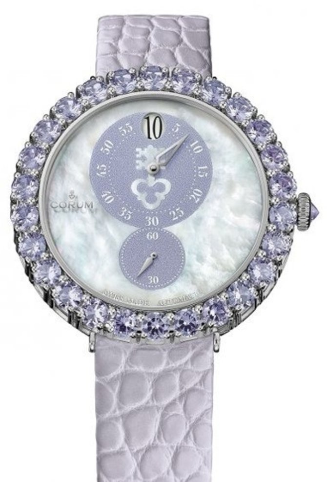 Женская модель наручных швейцарских часов Corum Heritage Eleganza Z254/03644 - 254.112.17/0090 EL07 представлена в корпусе из серебра. Установленный в часах механизм от Corum отличается автоматическим подзаводом, запасом хода на 42 часа работы и индикацией текущего времени. Циферблат выполнен из натурального морского перламутра. Ремешок из натуральной кожи аллигатора представлен в сиреневом цвете. Время показывается нетрадиционным способом: часы в окошке сверху основного циферблата, секунды на крупном субциферблате ретроградной стрелкой и секунды на малом субциферблате. Безель украшен голубыми сапфирами. Водонепроницаемость корпуса швейцарских часов находится на уровне 30 метров. ограниченный тираж - 18 экземпляров.