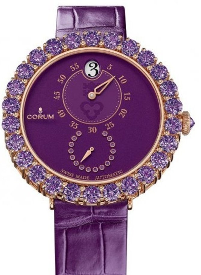В корпусе из розового золота, который обладает водонепроницаемостью до 30 метров, представлены швейцарские часы Corum Heritage Eleganza Z254/03649 - 254.112.85/0012 EL03, функционирующие на базе автоматического механизма мануфактурной сборки специалистов Corum. Этот часовой калибр обеспечивает индикацию часов, минут и секунд. На руке часы крепятся ремешком из натуральной кожи аллигатора фиолетового цвета и классической застежкой из розового золота. Стекло, которое было установлено для защиты циферблата, изготовлено из сапфирового кристалла. В окне сверху основного циферблата показываются часы, данные минут индицируются немного ниже - на крупном субциферблате, а малый субциферблат внизу основного служит для показания данных секунд. Безель и секундная зона инкрустированы фиолетовыми сапфирами.