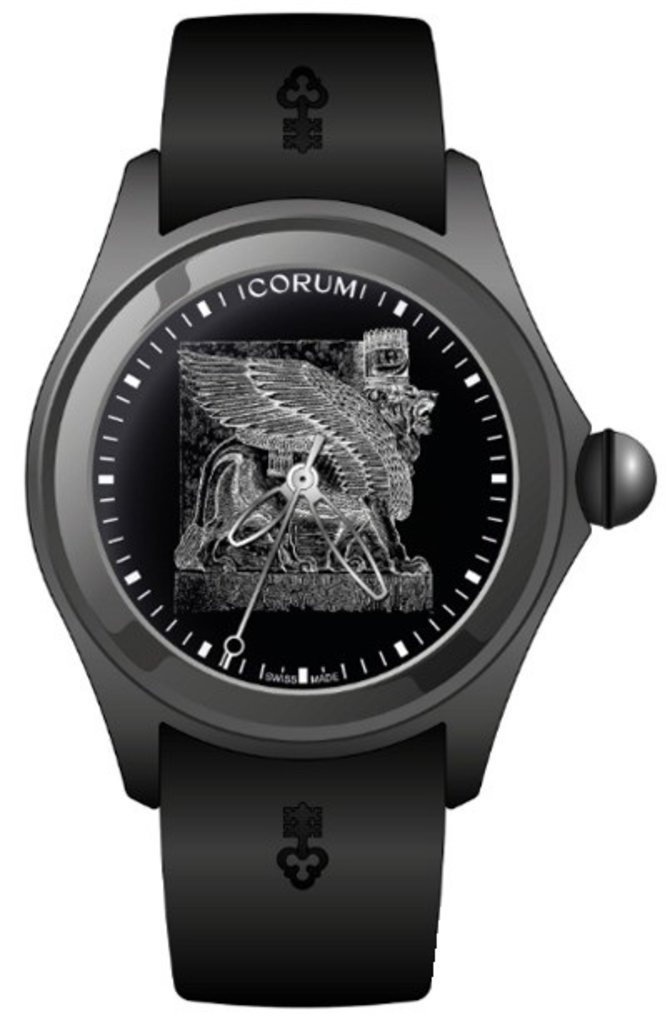 Циферблат часов накрыт выпуклым сапфировым стеклом с многослойным антибликовым покрытием. Круглый титановый корпус (52 х 20.2 мм) с покрытием PVD. Внутри него размещен автоматический калибр CO 403 с 65 часами запаса хода. Индикация данных - часы, минуты, секунды. Часы укомплектованы ремнем из каучука, что выполнен в черном цвете. На запястье модель крепится с помощью титановой застежки классического типа. Водонепроницаемость, заявленная Corum - 100 метров. Циферблат художественного типа с изображением льва.