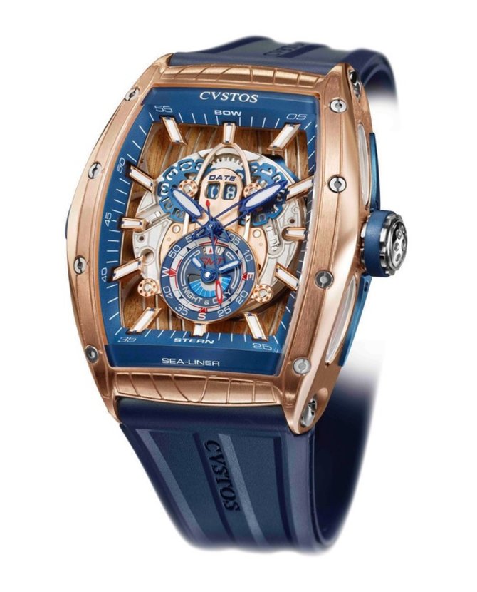 Известная часовая торговая марка Cvstos презентовала разработку "Challenge Sea Liner GMT Pink Gold" с индикатором времени второго часового пояса и индикатором дня/ночи. Кроме основных усложнений данной модели, на роскошном циферблате новинки также указываются часы, минуты, секунды и дата. Корпус выполнен в форме бочки из розового золота с ручной гравировкой. Безель зафиксирован винтами из титана. Яркий многофункциональный циферблат защищает сапфировое стекло. С обратной стороны корпуса, в виде задней крышки, также установлено сапфировое стекло. Часовые метки с нанесением люминесцентного состава. Внутри часового корпуса инженеры компании Cvstos разместили мануфактурный механический механизм с автоподзаводом и 42-часовым запасом хода. Заводная головка из нержавеющей стали. Укомплектована данная модель синим каучуковым ремешком с классической застежкой из розового 18-каратного золота. Герметичность корпуса представленных швейцарских часов Cvstos - 100 метров.