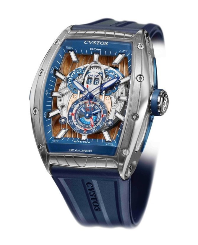 Известная часовая торговая марка Cvstos презентовала разработку "Challenge Sea Liner GMT Steel" с индикатором времени второго часового пояса и индикатором дня/ночи. Кроме основных усложнений данной модели, на роскошном циферблате новинки также указываются часы, минуты, секунды и дата. Корпус выполнен в форме бочки из нержавеющей стали с ручной гравировкой. Безель зафиксирован винтами из титана. Яркий многофункциональный циферблат защищает сапфировое стекло. С обратной стороны корпуса, в виде задней крышки, также установлено сапфировое стекло. Часовые метки с нанесением люминесцентного состава. Внутри часового корпуса инженеры компании Cvstos разместили мануфактурный механический механизм с автоподзаводом и 42-часовым запасом хода. Заводная головка из нержавеющей стали. Укомплектована данная модель синим каучуковым ремешком с классической застежкой из стали. Герметичность корпуса представленных швейцарских часов Cvstos - 100 метров.
