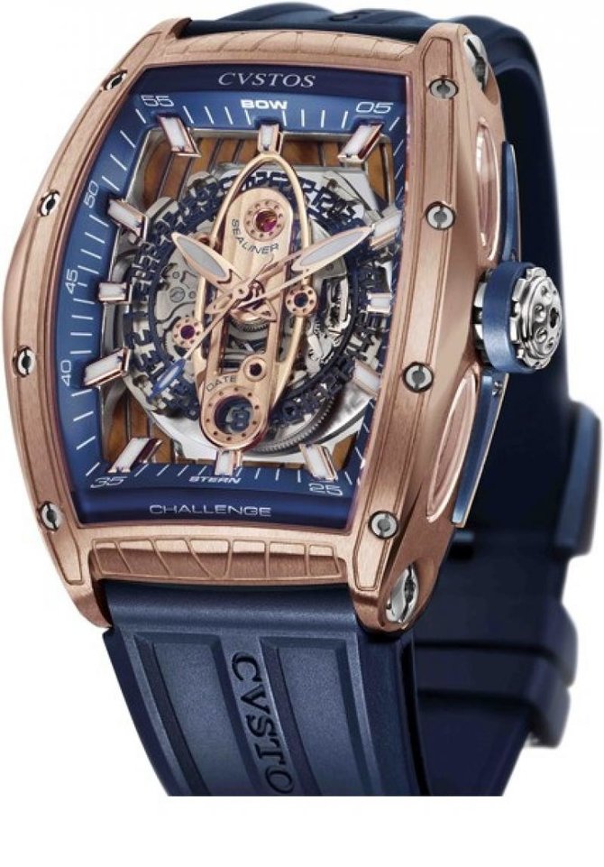 Швейцарские часы в бочкообразном корпусе, размером: 53.70 x 41 мм; есть варианты корпусов большего размера: 59 x 45 мм. Корпус представленной модели произведен из розового золота. Также есть варианты корпусов из стали, комбинированных (сталь+золото), с инкрустацией белыми бриллиантами и синими сапфировыми камнями. Механизм часов с автоподзаводом и 42-часовым запасом хода. Циферблат-скелетон. Задняя крышка из сапфирового стекла. Технология бренда Cvstos гораздо больше, чем сама торговая марка. Уникальная философия была создана на качественном выполнении 4-х главных ценностей – элегантность, эффективность, работа и ценность. После успешного объединения данных принципов появилась легенда часового будущего. Фирма Cvstos является хранителем молодой и инновационной концепции мастерства производства наручных часов, созданного без пустых похвал. Представляемые часы рождают упоение и признание настоящих профессиональных часовых коллекционеров всей планеты. Молодая часовая фирма, содержащая в себе мощность и целостность, постоянно повышает рост известности и востребованности к их произведениям через инновационный подход изготовления наручных часов.