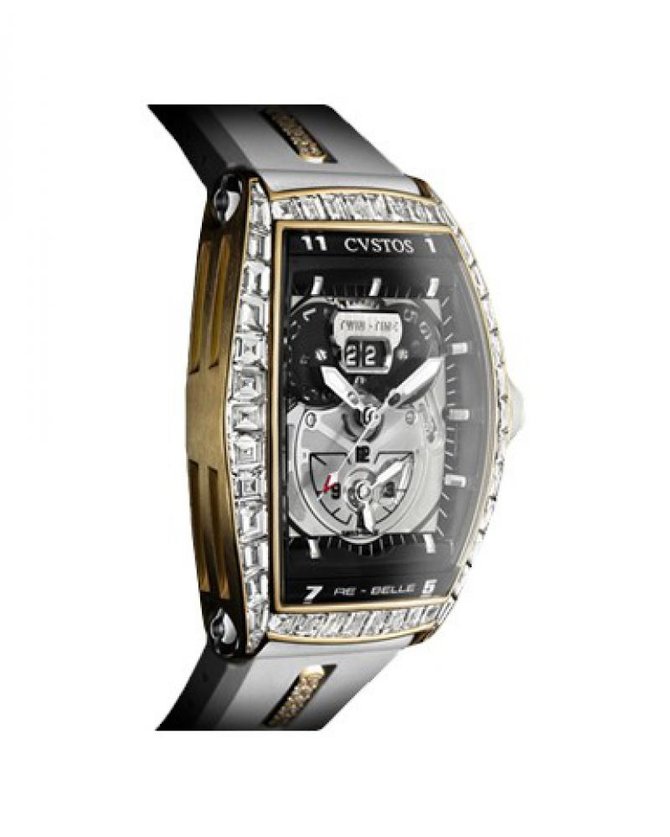 Швейцарская часовая марка Cvstos пока не так широко известна в нашей стране, однако она, вне всякого сомнения, заслуживает внимания. Несмотря на то, что у Cvstos нет за плечами вековой впечатляющей истории, как у маститых швейцарских брендов, и ее основателю немногим больше двадцати лет, за ней стоит фигура такой легендарной мануфактуры как Franck Muller, так как ее глава является родным отцом Сассуна Сирмакеса, вдохновителя и создателя молодой марки. Восхитительные женские часы Cvstos Re-Belle Twin-Time Joaillerie RG-D-Black представлены в корпусе из розового золота. Безель из белых багетных бриллиантов. Механизм c автоматическим заводом калибра CVSTOS 551, 21 камень, запас хода 42 часа. Кроме стандартных функций (часы, минуты, секунды и дата), часы могут похвастаться таким усложнением, как двойное время. Модель поставляется на каучуковом ремешке с вставкой из розового золота 18к.