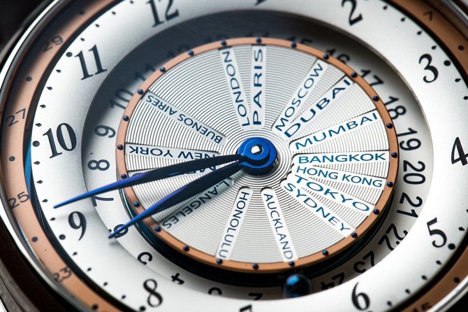 Пополнение модельного ряда швейцарский часов от мирового бренда De Bethune. De Bethune DB25 World Traveller имеют корпус круглой формы из белого золота, диаметром 45 миллиметров. Многофункциональный циферблат часов, создаваемый с применением техники ручного гильоширования, закрыт сапфировым стеклом. На циферблате указываются такие функции: часы, минуты, секунды, дата, индикатор день/ночь, а также индикация мирового времени. За выполнение этих функций отвечает швейцарский мануфактурный механизм от De Bethune с ручным подзаводом. Ремешок из кожи аллигатора коричневого цвета поможет зафиксировать часы на руке с помощью классической пряжки из белого золота. Модель De Bethune DB25 World Traveller выпущена в 2016 году.