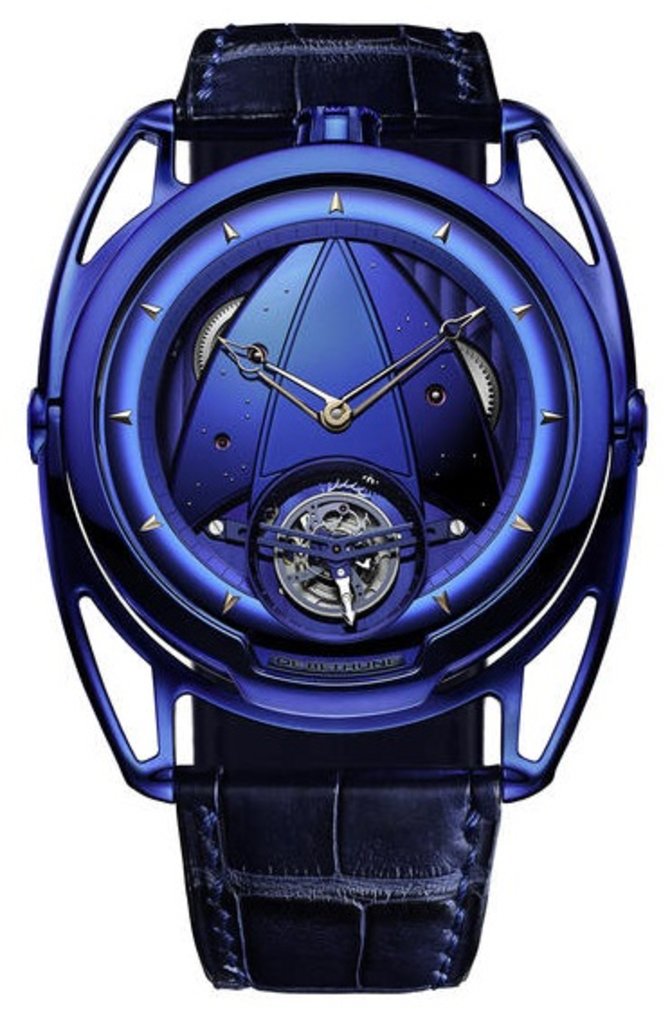 Часовой Дом De Bethune презентует модель DB28T Kind of Blue в корпусе сложной формы из титана. Установленный в модели механический калибр DB 2009 действует от ручного подзавода, обладает функцией турбийона и индикатором запаса хода механизма, который в этих часах длится 5 дней. Титановый корпус имеет такие параметры: 42.6 х 9.2 мм. Водостойкость не высокая - 30 метров. Ремешок пошит вручную в стенах мануфактуры De Bethune из натуральной крокодиловой кожи. Застежка раскладная, титановая. Стоит отметить, что турбийон в этих часах является самым легким турбийоном в мире, его вес всего 0.20 грамм. В действие механизм приводит саморегулирующийся двойной барабан, разработанный инженерами компании De Bethune. Циферблат полускелетонизированный. За сохранность циферблата несет ответственность высокопрочное сапфировое стекло с двойным антибликовым покрытием.