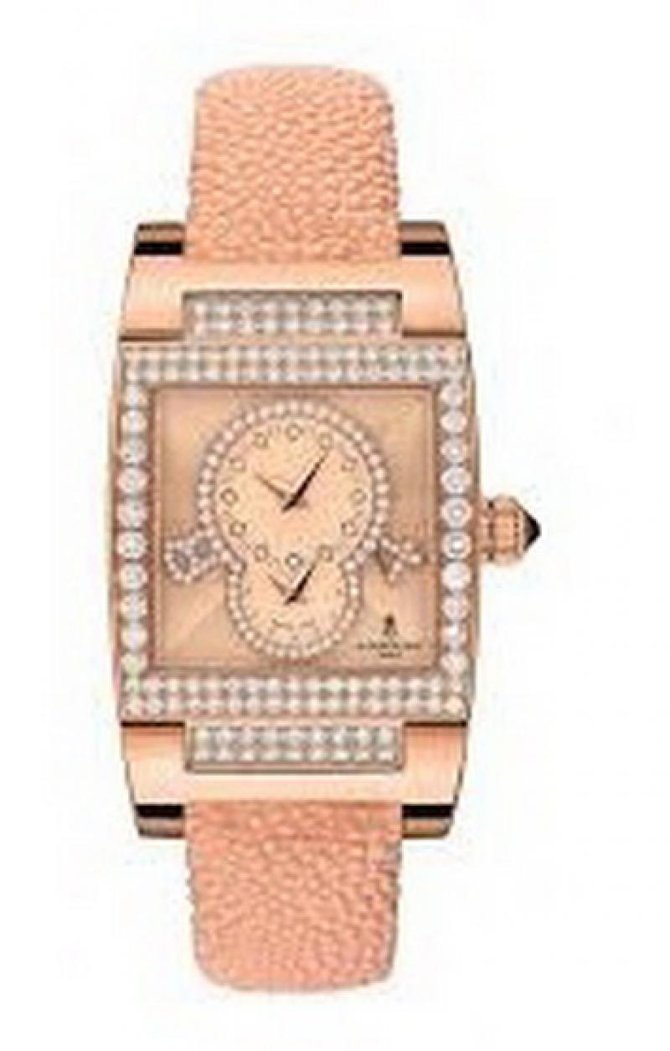 Элегантные швейцарские наручные часы, созданные известной ювелирной и часовой компанией deGrisogono специально для женщин, функционируют от механизма с автоматическим подзаводом, расположенным в корпусе из розового золота с инкрустацией белыми классическими бриллиантами. Укомплектована модель ремешком из кожи ската с классической золотой застежкой. Заводная головка украшена черным бриллиантом. Циферблат надежно защищает прочное сапфировое стекло. Водонепроницаемость часов составляет 3 атм., то есть способна вынести давление до 30-метровой глубины. Особенностью данной модели считается функция GMT (функция двойного времени). Швейцарская фирма de GRISOGONO. Создатель - опытный и амбициозный ювелир Фаваз Груози. Этот человек четко знает, чего он хочет. Талант, удача, смелость и креативность – его несменные спутники.