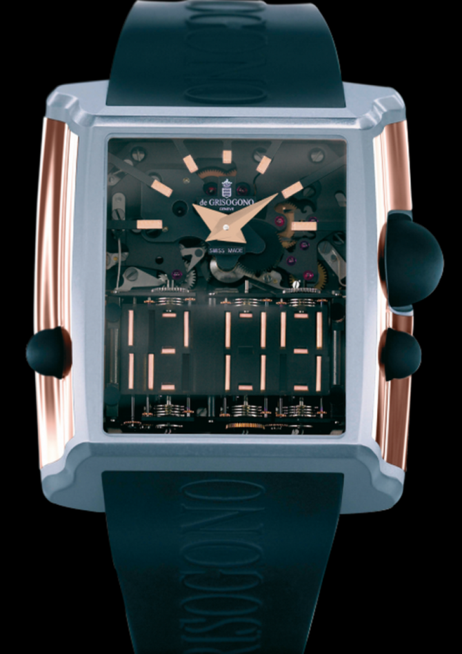Швейцарская фирма deGrisogono представляет серию наручных часов со спортивным дизайном MECCANICO DG. На скелетонизированном циферблате часов, защищенном сапфировым стеклом с антибликовым покрытием, отображаются часы и минуты аналоговым и цифровым способом, а также уровень запаса хода. Часы оснащены ремешком из натурального каучука с раскладывающейся застежкой, изготовленной из того же металла, что и часовой корпус. Часовые метки и стрелки покрыты специальным люминесцентным раствором, светящимся в темноте. Заводная головка покрыта каучуковой вставкой для избежания ее прокручивания. На ремешок нанесена фирменная надпись в виде названия бренда deGrisogono. Механизм с ручным подзаводом обладает 35\часовым запасом хода. Возможна индикация времени двух часовых поясов. Размеры корпуса - 56 x 48 миллиметров. Главная брендовая особенность de GRISOGONO - это игра с цветом.