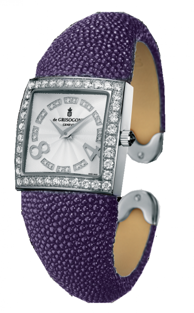 Женская модель наручных часов в корпусе из полированного золота с инкрустацией белыми классическими бриллиантами представляет швейцарская компания, славящаяся своими часовыми и ювелирными шедеврами - deGrisogono. Благодаря кварцевому часовому механизму, на гильошированном вручную циферблате показывается самая необходимая функция часов - индикация текущего времени. Сам циферблат от различного рода повреждений защищен сапфировым стеклом с антибликовыми свойствами. На "заводной" головке модели размещен черный бриллиант. Известно, что использование черных бриллиантов для декорирования часовых моделей было придумано основателем бренда deGrisogono -ювелиром Фавазом Груози. Комплектуются женские часы браслетом из кожи ската с золотыми окончаниями. Герметичность корпуса составляет 30 метров глубины (3 атм.). Львиная натура Фаваза отображается во всех его ювелирных творениях. Они насквозь пропитаны страстью, огнем, креативностью и неординарностью.