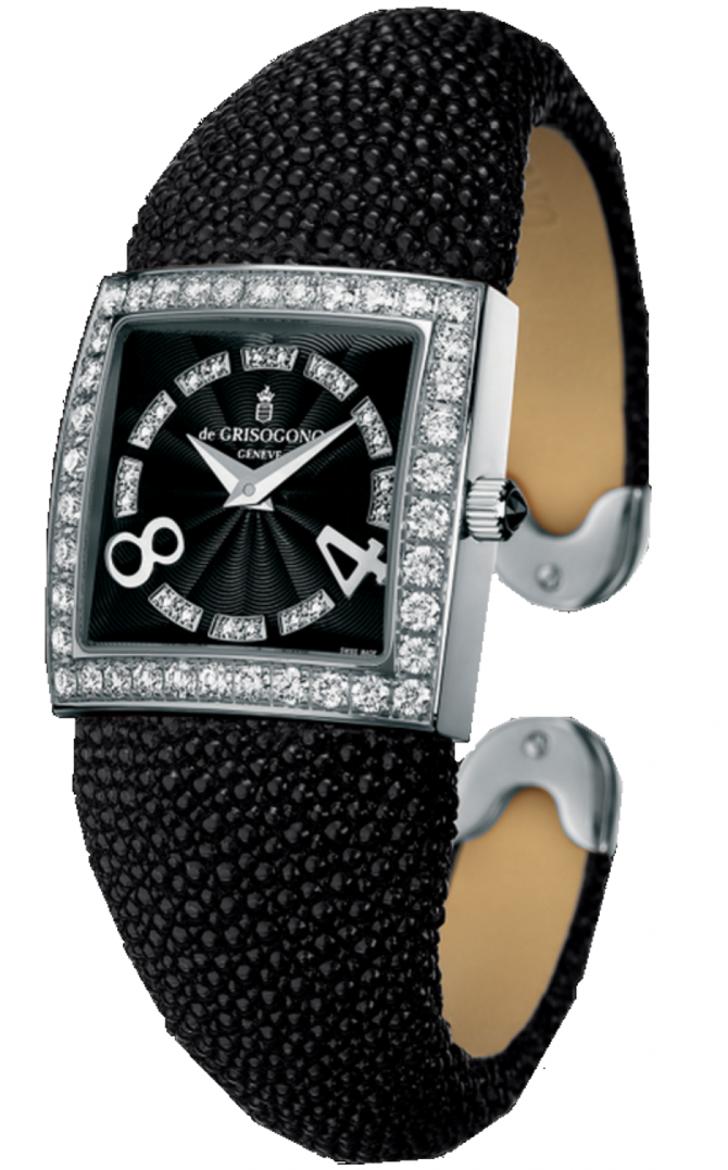 Женская модель наручных часов в корпусе из полированного золота с инкрустацией белыми классическими бриллиантами представляет швейцарская компания, славящаяся своими часовыми и ювелирными шедеврами - deGrisogono. Благодаря кварцевому часовому механизму, на гильошированном вручную циферблате показывается самая необходимая функция часов - индикация текущего времени. Сам циферблат от различного рода повреждений защищен сапфировым стеклом с антибликовыми свойствами. На "заводной" головке модели размещен черный бриллиант. Известно, что использование черных бриллиантов для декорирования часовых моделей было придумано основателем бренда deGrisogono -ювелиром Фавазом Груози. Комплектуются женские часы браслетом из кожи ската с золотыми окончаниями. Герметичность корпуса составляет 30 метров глубины (3 атм.). Львиная натура Фаваза отображается во всех его ювелирных творениях. Они насквозь пропитаны страстью, огнем, креативностью и неординарностью.