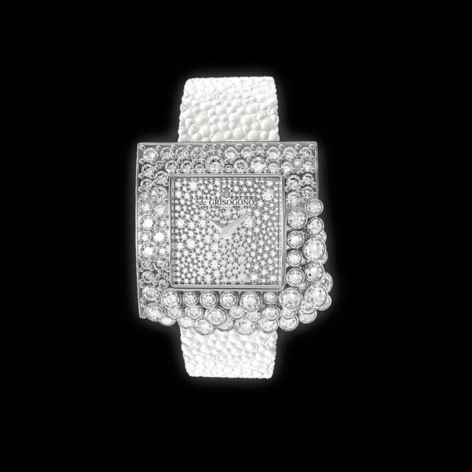 Модели ювелирных женских наручных часов коллекции SUGAR, швейцарского бренда-законодателя моды de Grisogono - это настоящая драгоценность. Роскошный золотой корпус обрамляют множество драгоценных камней. Циферблаты коллекции декорируются перламутром и бриллиантами. На защищенном сапфировым стеклом с антибликовыми свойствами циферблате отображается главнейшая функция наручных часов - индикация текущего времени. В комплект входит ремешок, изготовленный из натуральной кожи ската, с раскладывающейся золотой застежкой, инкрустированной драгоценными камнями. У бренда появился собственный, узнаваемый сегодня, стиль. Главная особенность компании de GRISOGONO – это игра с цветом. Особенно запоминаются украшения с черными бриллиантами, на которые некогда сделал ставку Фаваз - основатель фирмы. Большое количество драгоценных камней - это легкое движение, мерцающее с каждым поворотом запястья. Внутри корпуса находится кварцевый часовой механизм. Водостойкость корпуса - до 30 метров (3 атм.)