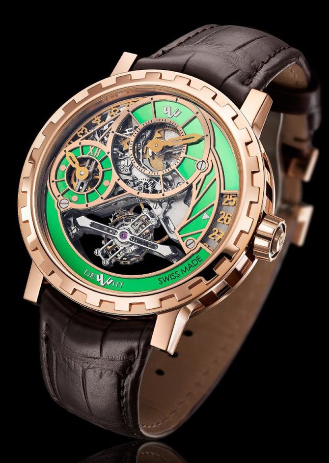 Известный Часовой Дом DeWitt презентует собственное новое техническое достижение - часы Academia Grand Tourbillon, в полной мере являющиеся мануфактурными, вышедшие лимитированной серией 99 экземпляров. Новинка Academia обладает калибром DW 8030. Предыдущий калибр DW 8028 был впервые представлен в 2010 году. Он является первым механизмом с ручным подзаводом и турбийоном, полностью выполненным на Мануфактуре. Калибр традиционной конструкции, состоящий из 327 деталей, имеет хорошо зарекомендовавшие себя технические характеристики: 18 000 полуколебаний в час, запас хода 65 часов, швейцарский анкерный спуск, спираль Straumann с кривой Филлипса (2,5 Гц). Циферблат часов выполнен в виде серебристой решетки, установленной над механизмом, он напоминает о колесных системах машинных двигателей начала века. В положении "3 часа" размещен указатель даты цвета розового золота с кнопкой настройки на боковой части корпуса. Под задней крышкой из сапфирового стекла расположен индикатор день/ночь: синий цвет обозначает ночь, а белый день. Декоративная отделка часов Academia Grand Tourbillon отвечает самым высоким стандартам Мануфактуры DeWitt. Сквозь сапфировое стекло задней крышки корпуса можно увидеть исключительную по качеству ручную работу: барабанный мост с пескоструйной обработкой и покрытием "Black Or", баланс цвета розового золота, сатинированный мост каретки с родиевым покрытием. Заводная головка и застежка ремешка из розового золота 750 пробы отмечены монограммой "W". Техническое совершенство и выразительный дизайн модели Academia Grand Tourbillon - яркий пример сочетания классических традиций часов с турбийоном со смелостью инженерного и эстетического поиска, свойственной творениям Жерома де Витта.
