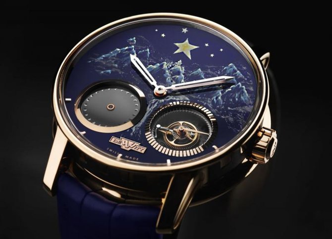 Новинка 2015 года - наручные часы от компании Dewitt с усложнениями "мертвая секунда" и "free seconds hand" - "Academia Out of Time" Unique Piece for Only Watch 2015, произведенные в честь шестого благотворительного аукциона "Only Watch", который пройдет в Женеве (Швейцария) 28-го сентября. Этот аукцион проходит всего единожды на два года, а вся прибыль от него тратится на исследования мышечной дистрофии Дюшенна, от которой страдают по статистике 1 мальчик на три с половиной тысячи. Усложнения: "мертвая секунда" или "dead-beat" - это усложнение в механических часах, состоящее в том, что секундная стрелка визуально двигается не плавно, то есть с частотой 6-8 движений в секунду, а скачками, как на кварцевых часах - один прыжок в секунду); "free seconds hand" - символически представляет противостояние между режимом реального и виртуального времени, которое мы не можем измерить с помощью обычных методов. Круглый корпус новой модели произведен из полированного розового 18-каратного золота с частицами черной резины. Диаметр - 42.5; толщина - 12.85; герметичность - 30 метров. На рифленой заводной головке выгравирован логотип компании Dewitt. Корпус с двух сторон защищен сапфировым стеклом, сквозь которое сзади корпуса виден мануфактурный швейцарский автоматический механизм DW1201 на 38 камнях, с балансовой частотой 21600 пк/час, благодаря которому на лаковом циферблате синего цвета с художественным изображением гор и звездного неба указываются часы и минуты золотыми скелетонизированными стрелками.