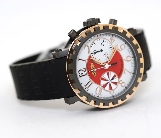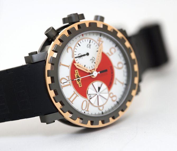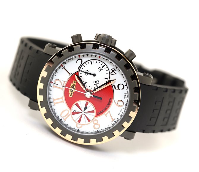 В комбинированном корпусе из титана и розового золота швейцарских часовDewitt Academia Chronographe in 2 Tone on Black Rubber Strap with White Dial AC.6005.53A.M500 находится мануфактурный часовой механический калибр с автоподзаводом и функцией хронографа, что обеспечивает измерение промежутков времени. Белый зонированный циферблат с золотыми метками и стрелками служит для индикации часов, минут, секунд, а также данных функции хронографа. Механизм часов разработан инженерами компании Dewitt. Циферблат бело-красного цвета накрыт стеклом из сапфирового кристалла, на которое нанесено противобликовое покрытие. Ремешок из каучука черного цвета обладает классической титановой застежкой.