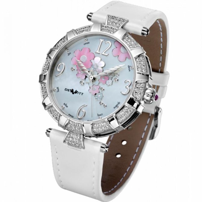 Новая женская коллекция DeWitt Golden Afternoon вдохновлена творчеством прерафаэлитов, воспевавших красоту женщины и природы, а также произведениями Льюиса Кэрролла. На циферблате развернулся волшебный узор в виде цветов разных размеров и оттенков на фоне шоколадно-коричневого перламутра. 14 белых бриллиантов, как капли росы, осели среди нежно-розовых лепестков. Часовая и минутная стрелки напоминают по форме крылья ангела, а на кончике секундной стрелки поместился маленький язычок пламени. Заводная головка украшена сапфировым кабошоном. Модель представлена в корпусе из белого золота 18 карат. Калибр механический ETA 2892 с автоматическим подзаводом и запасом хода до 42 часов, частота колебаний баланса 28,800 пк/час. Водонепроницаемость до 30 м. Ремешок сатиновый с вставкой из белого золота.