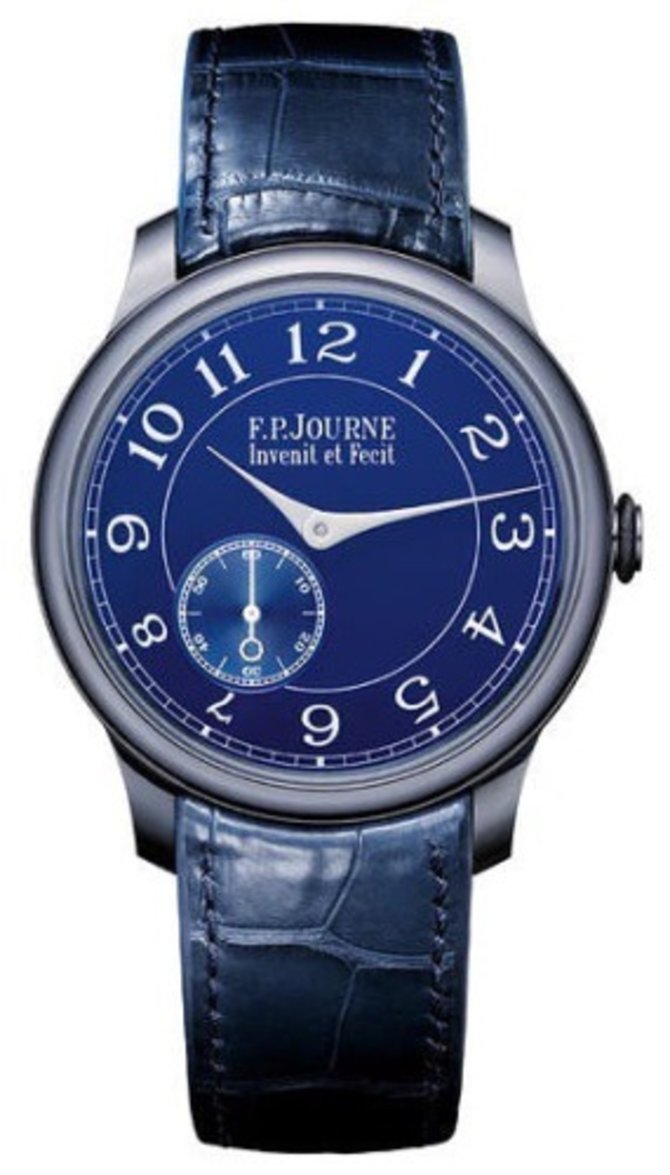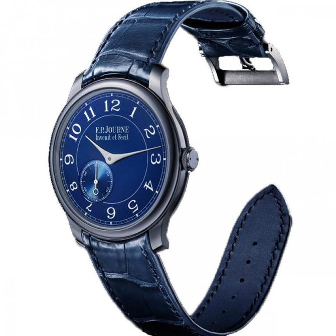 Эта модель номинировалась на звание «Лучшие мужские часы» в престижном конкурсе, проводимом Женевским часовым Гран При (GPHG). Chronometre Bleu предлагает Вам новый точный подход к совершенной высокой точности с безупречными хронометрическими качествами. Инновационный корпус впервые выполнен из тантала темно-серого цвета с легким синим оттенком. На синем циферблате расположились центральные стрелки часов и минут, а также циферблат малой секундной стрелки в позиции «7.30». Калибр FPJ 1304 с ручным заводом выполнен из розового золота, частотой колебаний баланса 21,600 пк/час, двойные барабаны работают параллельно, обеспечивая стабильный приток энергии для большей части указанного 56-часового запаса хода. Водонепроницаемость до 30 м. Ремешок из кожи аллигатора.