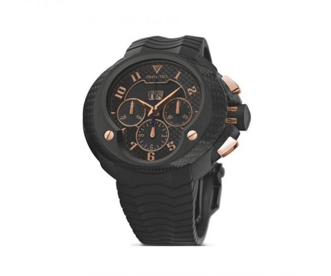 Chronographe Grand Dateur Automatique FV EVOS 8Ch - дайверские механические наручные часы, выпускаемые ограниченной серией, 88 экземпляров, швейцарской часовой компанией Franc Vila. Водостойкость комбинированного корпуса из нержавеющей стали с PVD-покрытием и карбона - 300 метров (30 Атм.). Часы успешно функционируют на швейцарском мануфактурном механизме с автоматическим подзаводом, Калибр FV8Ch. Основные особенности представленных наручных часов: функция хронографа и 300-метровая дайверская водостойкость. На традиционном для Franc Vila циферблате указываются часы, минуты, секунды, дата и счетчики хронографа. Запас хода механизма - 42 часа. Модель укомплектована ремешком из каучука с раскладывающейся застежкой.