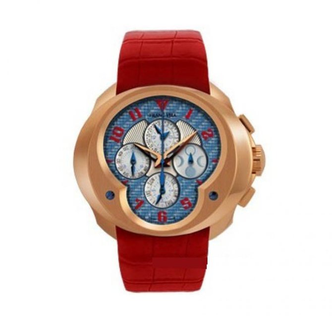 Элитные швейцарские наручные часы Chronograph Quantieme Grand Sport FVa12-9A, пополнившие коллекцию бренда Franc Vila - "Complication", представлены в корпусе из розового 18-каратного золота. Внутри корпуса инженеры компании разместили Калибр FV 12-9A - механический механизм с автоматическим подзаводом. Данный механизм обладает функцией хронографа, индикатором лунных фаз, а также обеспечивает индикацию на многофункциональном циферблате часов, минут, секунд, даты, дней недели, цикла високосного года и месяца. Циферблат произведен в форме, характерной всему модельному ряду Franc Vila - перевернутой восьмерки. Корпус водонепроницаем до 100 метровой глубины. Комплектуются швейцарские часы ремешком, пошитом вручную из натуральной кожи аллигатора с раскладывающейся золотой застежкой. Серия производства ограничена 88 экземплярами.