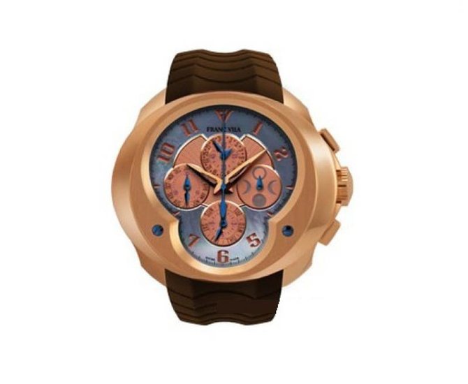 Представленная модель швейцарских наручных часов выпущена компанией Franc Vila ограниченной серией в 88 экземпляров. Корпус часов произведен из 18-каратного золота. Герметичность довольно массивного корпуса, обеспеченная сапфировым стеклом и завинчивающейся заводной головкой, составляет 100 метров. Кнопки хронографа расположены сверху и снизу от заводного ключа. Полную функциональность модели обеспечивает мануфактурный швейцарский механический часовой механизм FV12-9A с автоматическим подзаводом. К запястью швейцарские часы крепятся с помощью ремешка из каучука либо из натуральной кожи крокодила с раскладывающейся застежкой, выполненной из того же материала, что и корпус часов. Часовая торговая марка Franc Vila - одна из самых популярных элитных мануфактур Швейцарии. Модель Complication Chronograph Quantieme Haute Horlogerie - это астрономические часы с функцией хронографа, а также индикаторами лунных фаз и високосного года. Кроме основных часовых усложнений, многофункциональный циферблат часов, выполненный в форме перевернутой цифры "8", отображает часы, минуты, секунды, дату, дни недели и месяц.