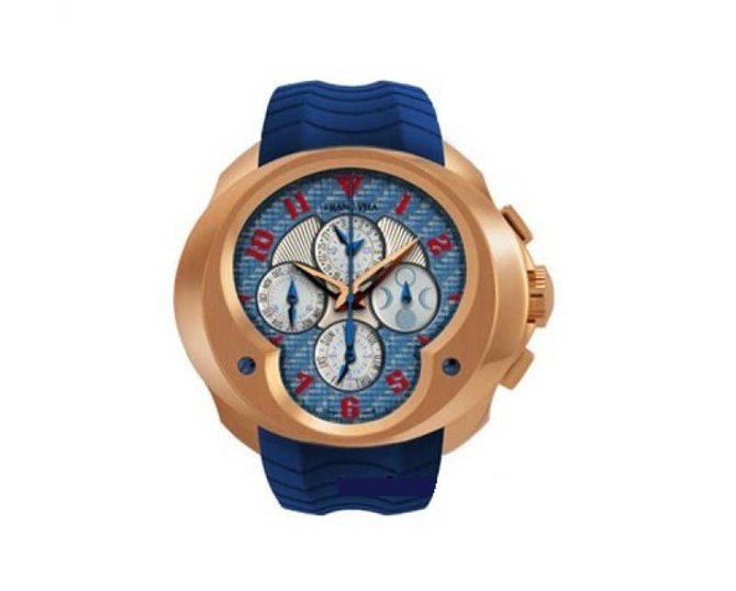 Торговая марка Franc Vila, одна из самых популярных швейцарских элитных часовых мануфактур, представляет наручные астрономические часы с функцией хронографа, индикаторами лунных фаз и високосного года - Chronograph Quantieme Grand Sport. Кроме основных часовых усложнений, многофункциональный циферблат часов, выполненный в форме перевернутой цифры "8", отображает часы, минуты, секунды, дату, дни недели и месяц. Модель выпущена ограниченной серией, 88 экземпляров, в корпусе из 18-каратного розового золота. Герметичность золотого корпуса, отчасти обеспеченная сапфировым стеклом и завинчивающейся заводной головкой, составляет 100 метров. Кнопки хронографа расположены сверху и снизу от заводного ключа. Функциональность модели обеспечивает мануфактурный швейцарский механический часовой механизм FV 12-9A с автоматическим подзаводом. К запястью швейцарские часы крепятся с помощью ремешка из каучука с раскладывающейся застежкой.