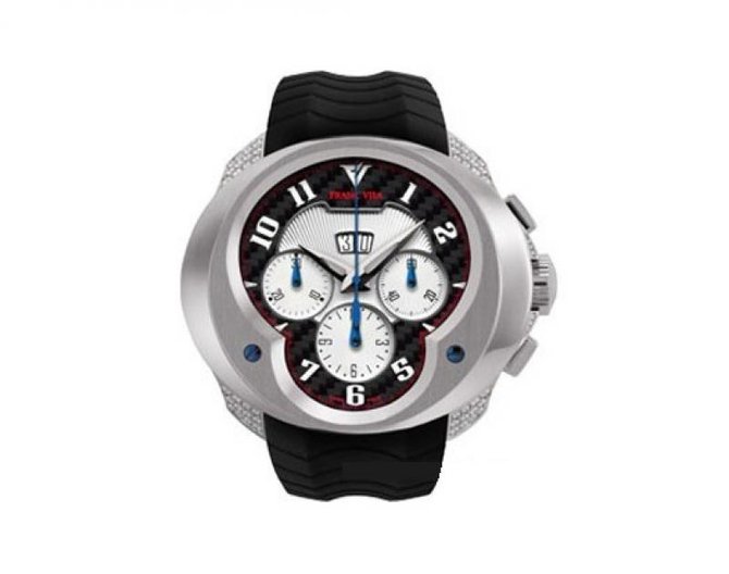 Часовая компания Franc Vila представляет механические наручные часы Chronograph Grand Dateur Haute Joaillerie FVa8Ch с автоматическим подзаводом и функцией хронографа, которые вошли в коллекцию "Complication". Корпус швейцарских часов выполнен из 18-каратного белого золота и инкрустирован натуральными белыми бриллиантами. Ремешок, идущий в комплекте с моделью, изготовлен из каучука и оснащен раскладывающейся застежкой. Корпус, имеющий нестандартную форму, герметичен до уровня 100 метров глубины. На циферблате, выполненном в форме перевернутой цифры "8", отображаются основные функции часов - индикация часов, минут и секунд, а также часовых усложнений - индикация счетчиков хронографа и даты сквозь специальное увеличительное стекло. Обратите внимание, что модель выпущена ограниченным тиражом в 88 экземпляров наручных часов на весь мир.